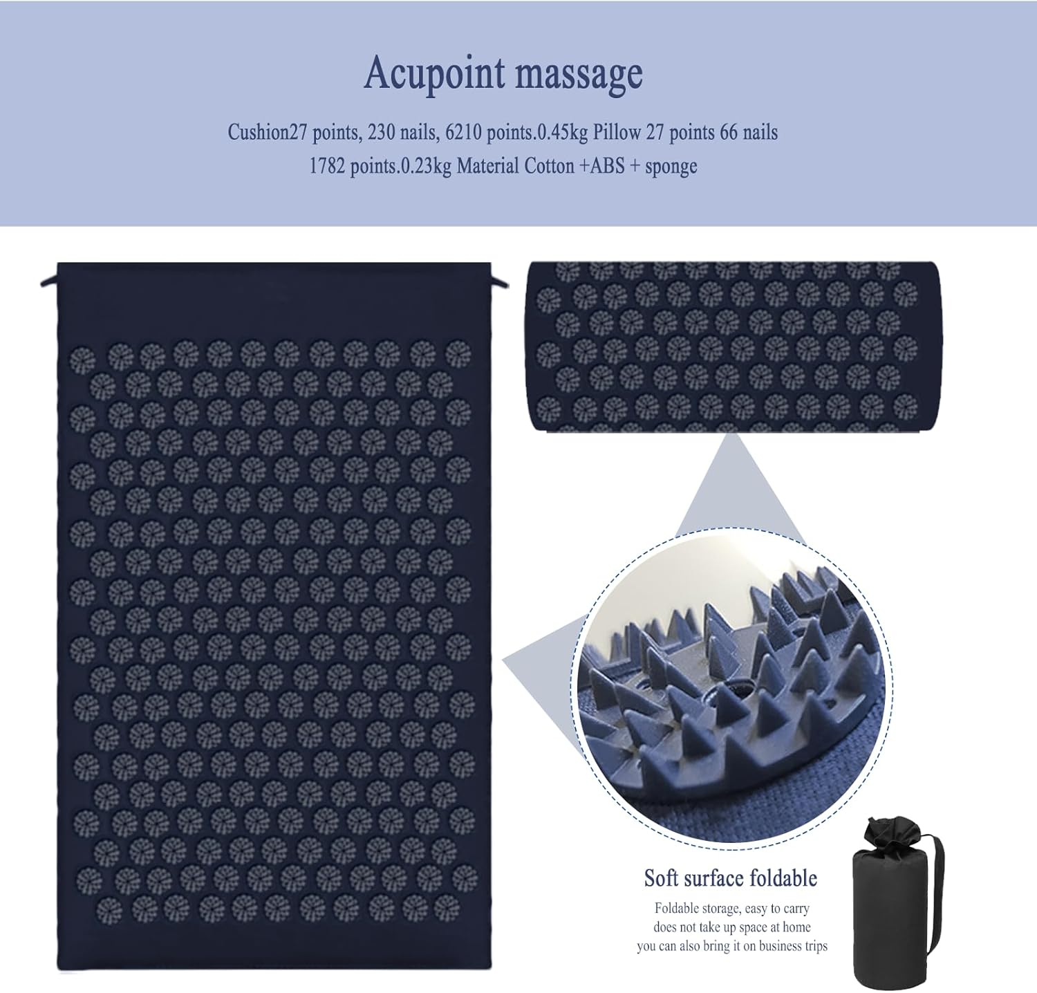 - Components: Includes an acupressure mat, pillow, and carry bag
